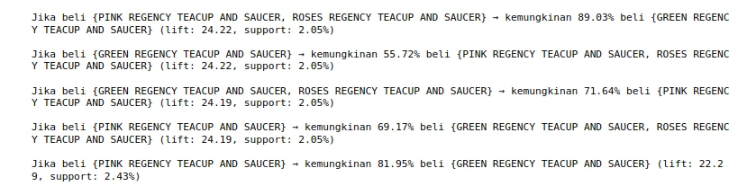 Setelah aturan asosiasi dihasilkan, kita perlu menginterpretasikannya untuk mendapatkan wawasan yang berguna. Kita akan menampilkan 5 aturan teratas yang diurutkan berdasarkan nilai lift tertinggi, kemudian confidence tertinggi. Untuk setiap aturan, kita akan menampilkan anteseden (item yang dibeli), konsekuen (item yang kemungkinan juga dibeli), serta nilai confidence, lift, dan support dari aturan tersebut.