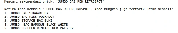 print(f"Mencari rekomendasi untuk: '{item_dibeli}'")